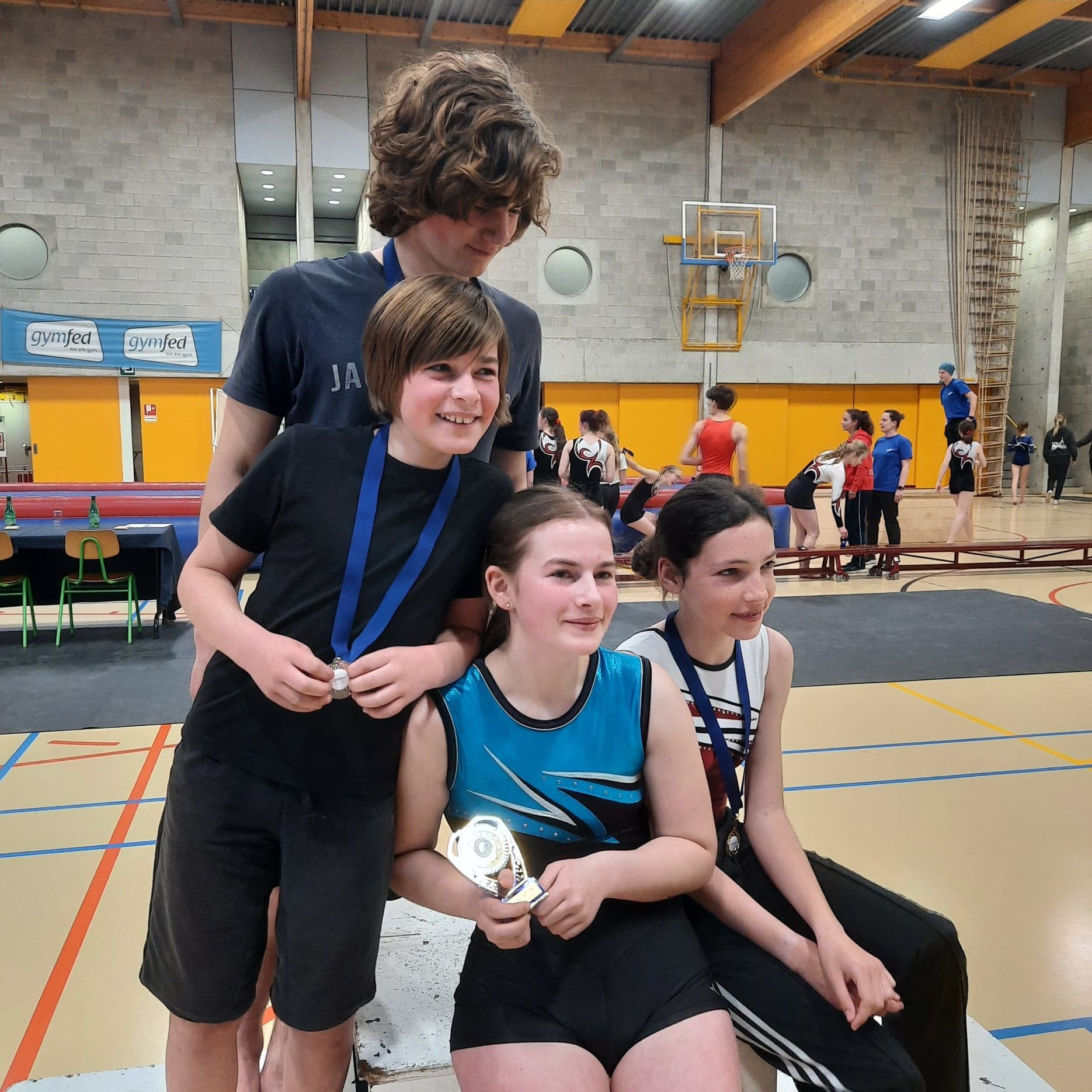 Enkele gymnasten van de airtrack van Holsbeek namen deel aan het recreatoernooi op 26 maart 2022 in Kieldrecht.